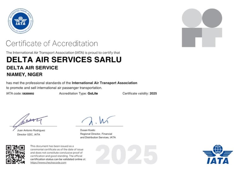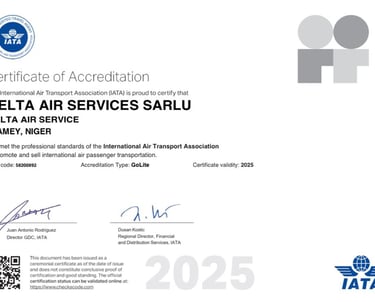 Delta Air Services, agence accréditée IATA pour des services aériens de qualité et conformes aux standards internationaux.